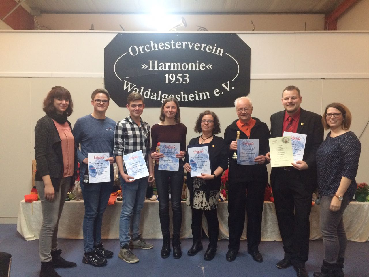 v.l.: Claudia Domehl (2. Vorsitzende), Marvin Eckes (10 Jahre aktiv), Fabian Schitthof (10 Jahre aktiv), Vivian Tannhäuser (5 Jahre aktiv), Monika Seitz (40 Jahre aktiv), Dietmar Maßfeller (25 Jahre fördernd), Thorsten Sturm (30 Jahre aktiv), Saskia Burkhardt (1. Vorsitzende)