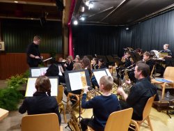 Nach großem Beifall und einer kleinen Umbauphase beginnt dann das Hauptorchester mit seinem ersten Stück “Jewel Fanfare” von Rainer Serwe. Die Musikerinnen und Musiker hatten sogar die Möglichkeit an ihrem Probewochenende das Stück mit dem Komponisten persönlich zu proben.